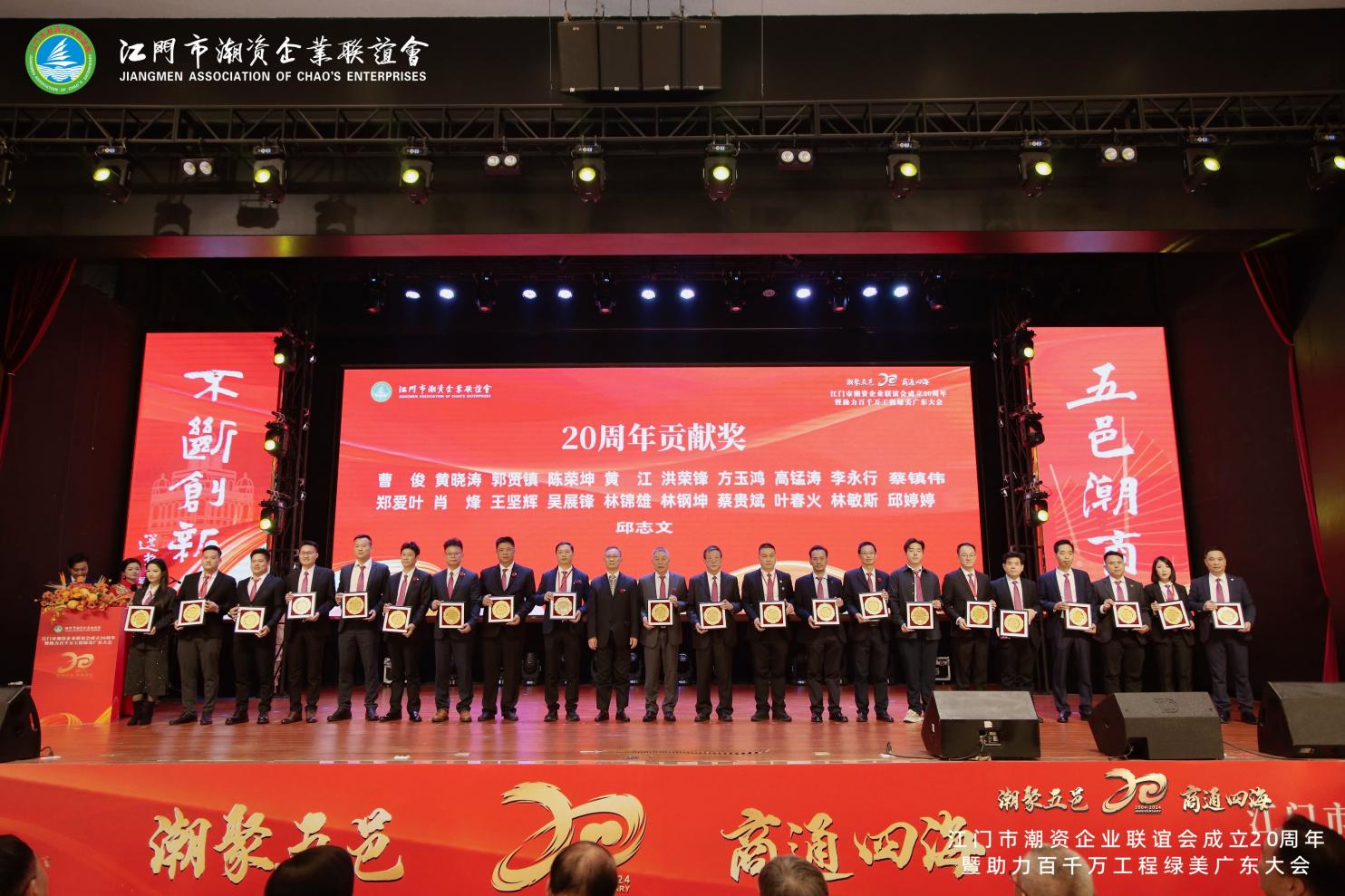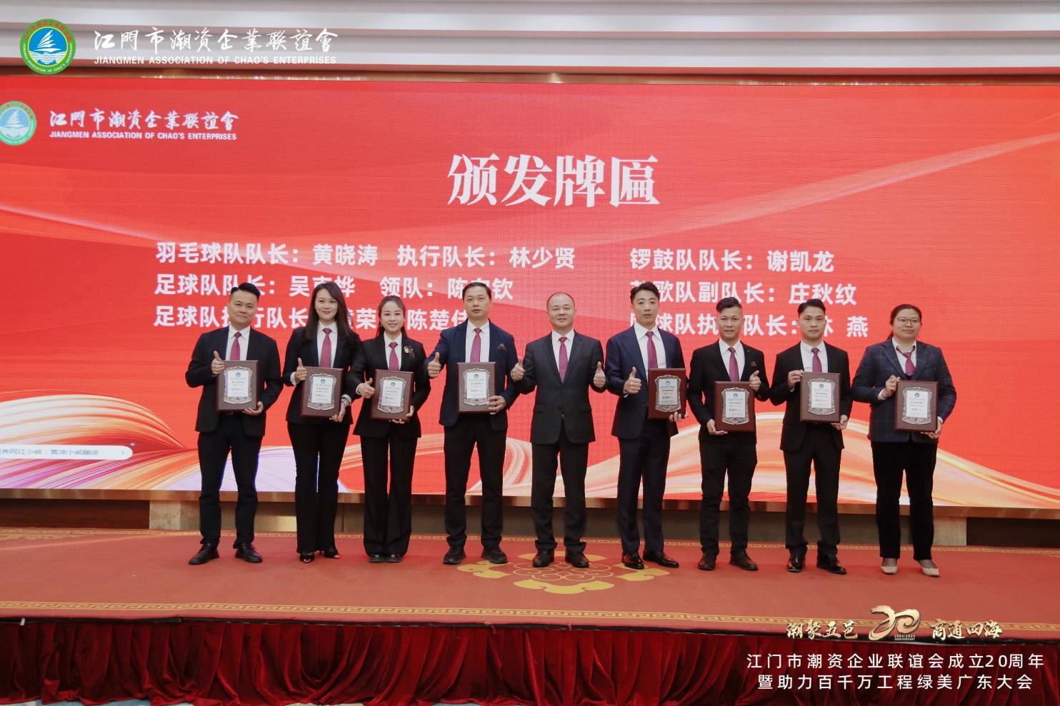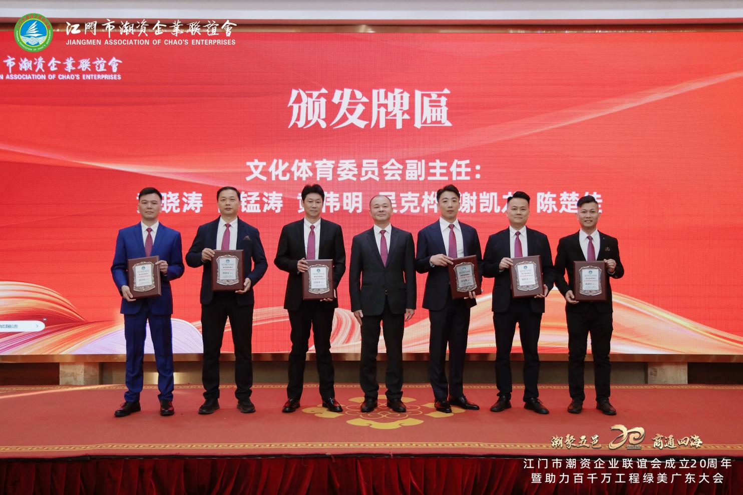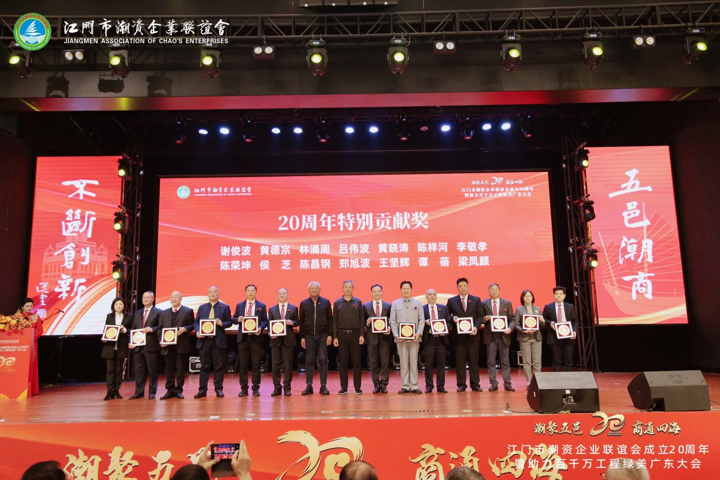 Zhao Jiyao, ancien président du Comité municipal de Jiangmen de la Conférence consultative politique du peuple chinois, et Liang Qingzhao, ancien directeur adjoint exécutif du Comité permanent de l'Assemblée populaire municipale de Jiangmen, ont remis le « Prix de contribution spéciale du 20e anniversaire » au vice-président Huang Xiaotao et à d'autres membres exceptionnels de l'association.
